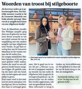 Eind maart werd in het stadhuis het eerste exemplaar overhandigd aan Ilze en dankbaar door haar in ontvangst genomen. Het is goed om te weten dat per 4 februari 2019 de wet is aangepast waardoor op verzoek van een ouder de stilgeboren baby (ongeacht de zwangerschapsduur) op de persoonslijst van de ouders kan worden opgenomen, ook met terugwerkende kracht. Meer informatie is terug te vinden op www.stillelevens.nl.
